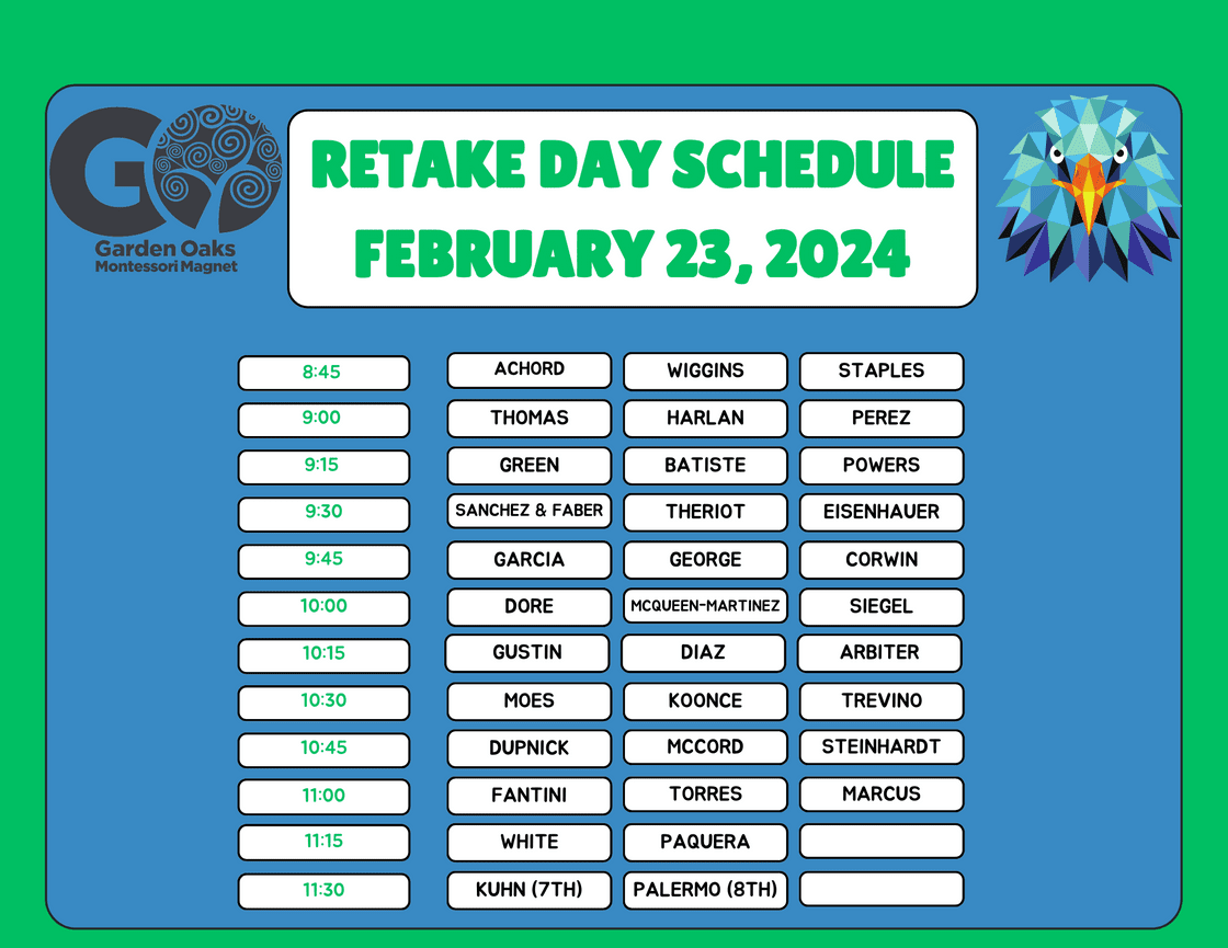 - RETAKES will be offered for Fall Portraits on February 23, 2024. Sign up for the School Picture Newsletter below to receive notices regarding fall pictures and retakes! If you have already been photographed, the new image will be uploaded into the same gallery as your original photos within 3 weeks of the retake date. Your retake order may incur additional shipping fees.