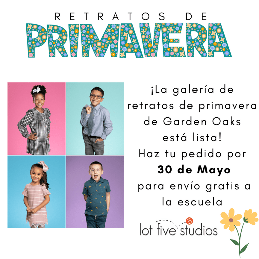 ¡Hola familias de Garden Oaks! Somos Lot Five Studios, una pequeña empresa de fotografía local con sede en Garden Oaks y Oak Forest con más de 13 años de experiencia fotografiando niños en las escuelas de nuestro vecindario. (¡Nuestros hijos también fueron a GOMM!)